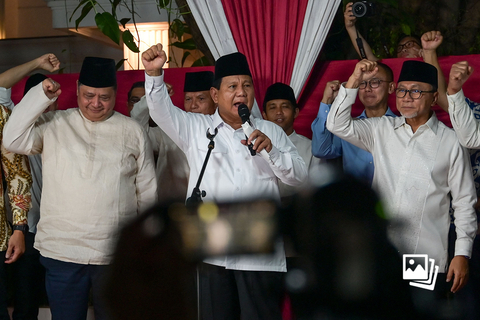 当地时间2024年3月20日,印度尼西亚雅加达,印度尼西亚总统候选人普拉博沃·苏比安托(中)在其联盟政党领导人的陪同下,在雅加达的住所发表胜选演说。据央视新闻报道,印度尼西亚选举委员会公布总统选举最终计票结果,现任国防部长普拉博沃及其竞选搭档、现任总统佐科的长子、梭罗市市长吉布兰以58.58%的得票率获胜,当选下一届正副总统。普拉博沃的总统就职仪式将于10月20日在印尼新首都努山塔拉举行。图:bay ismoyo/视觉中国 |